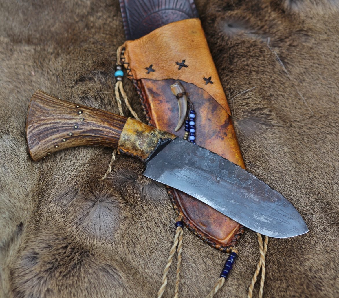 Forged from old saw steel and held in the whitetail antler handle with pitch glue and deer rawhide.