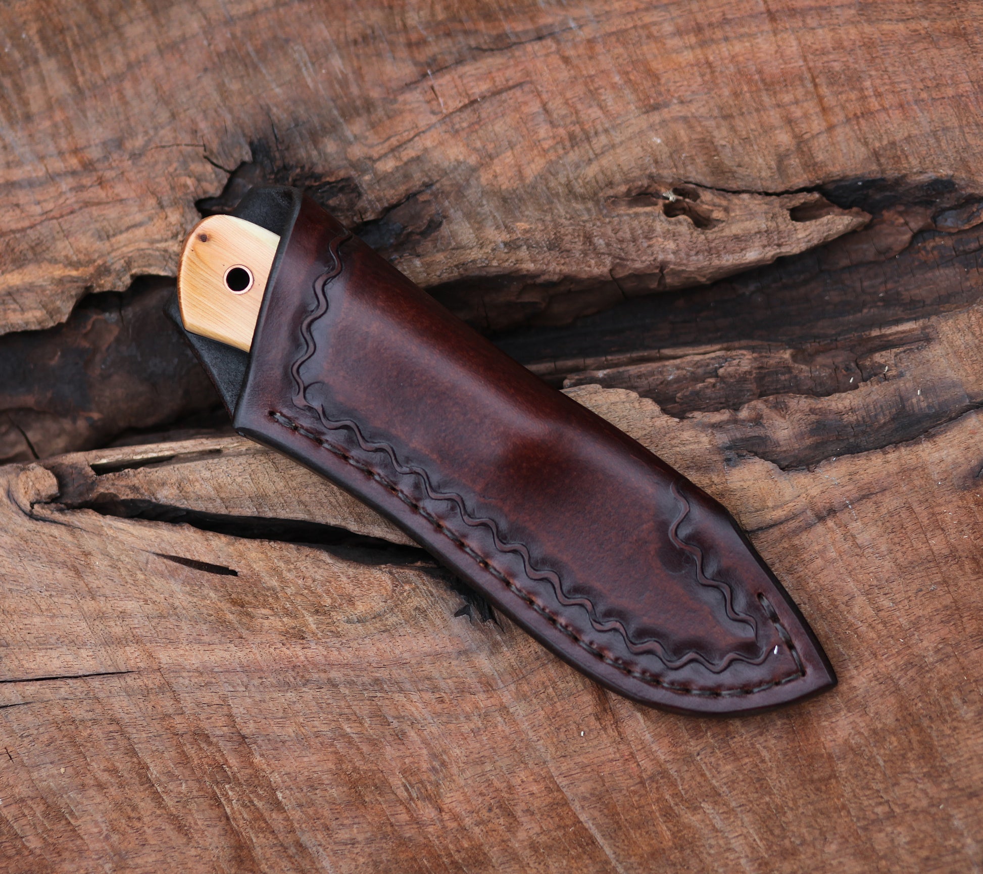 - Vertical hand tooled leather sheath is wet molded, knife stays put.