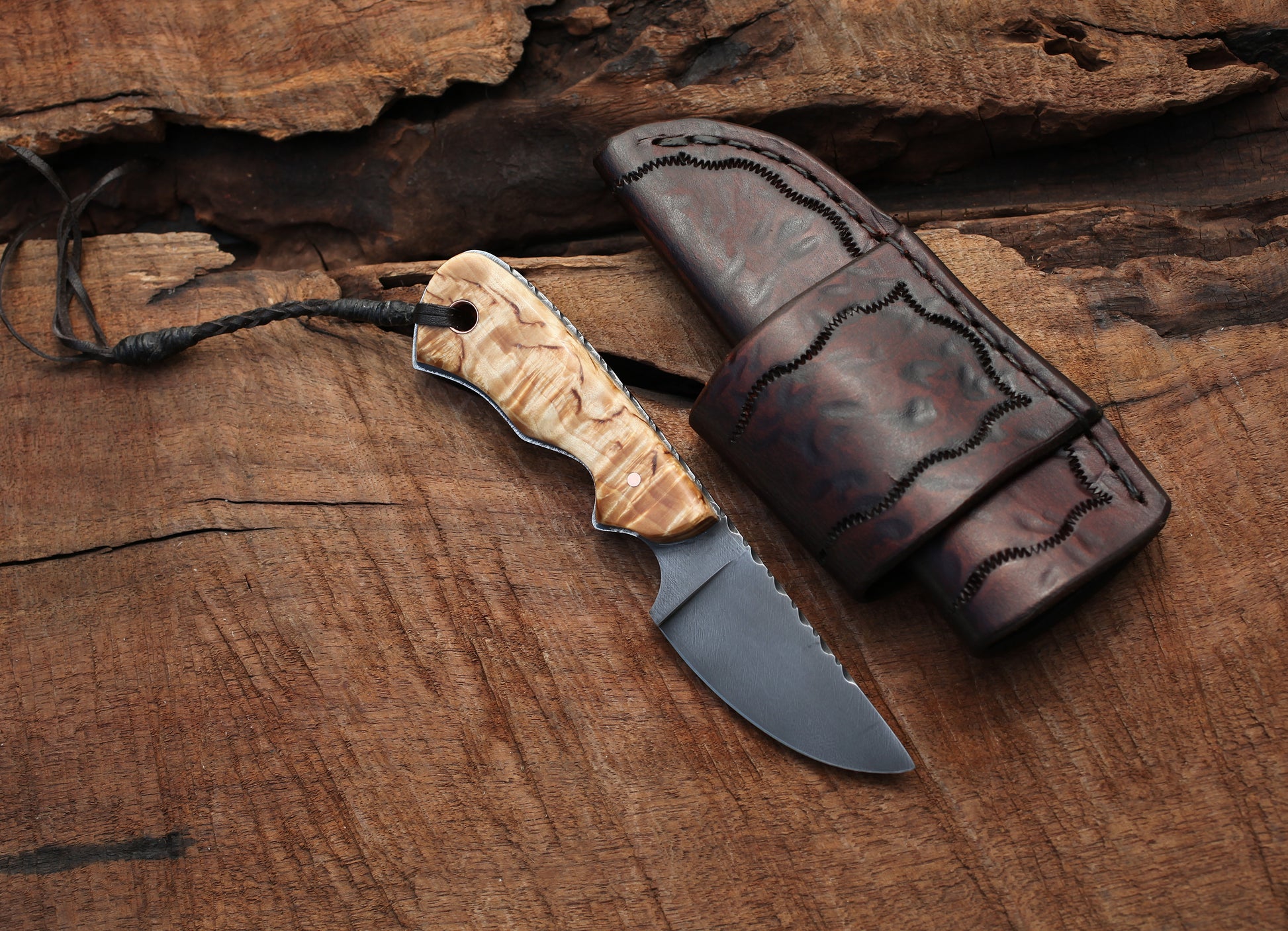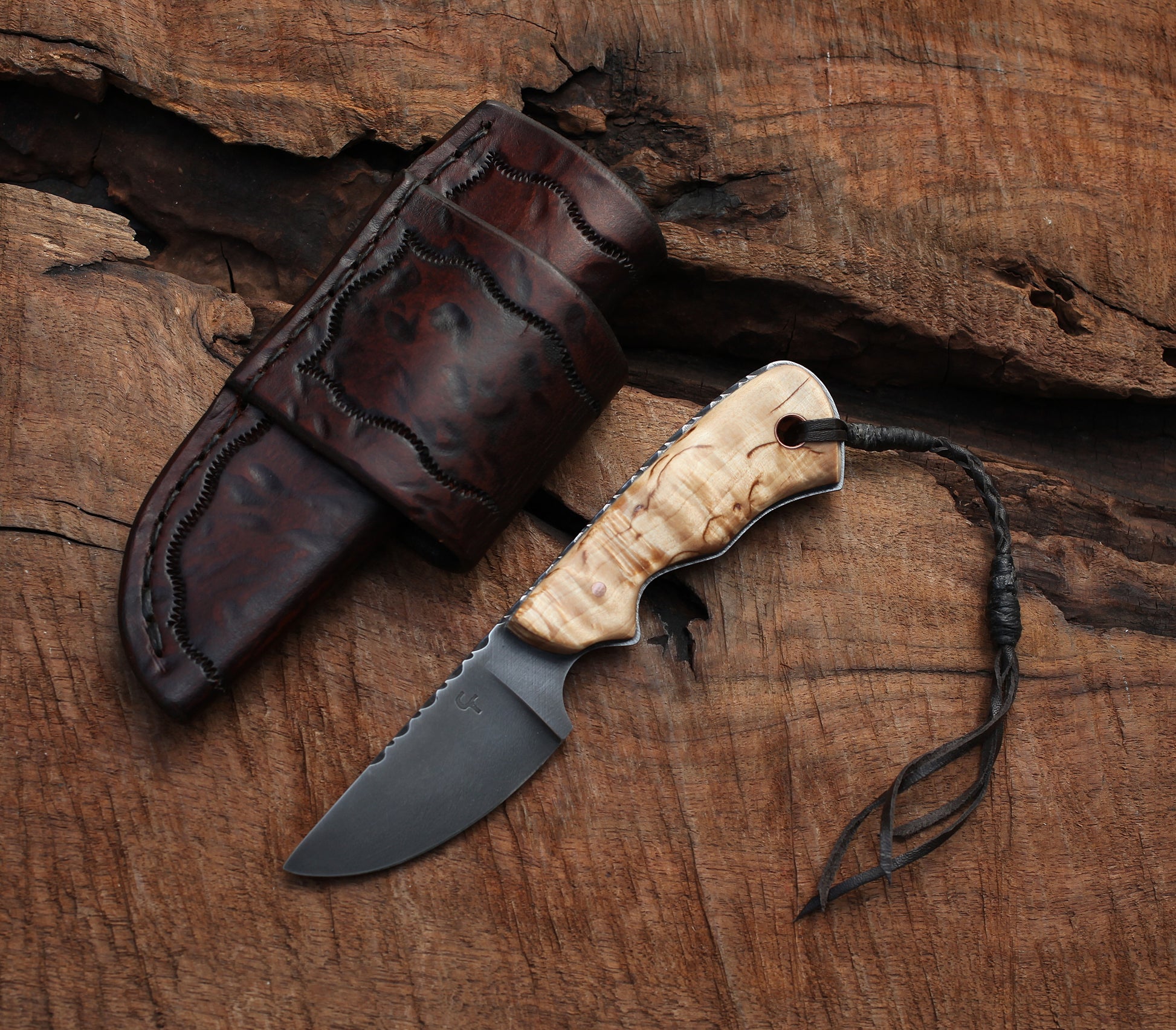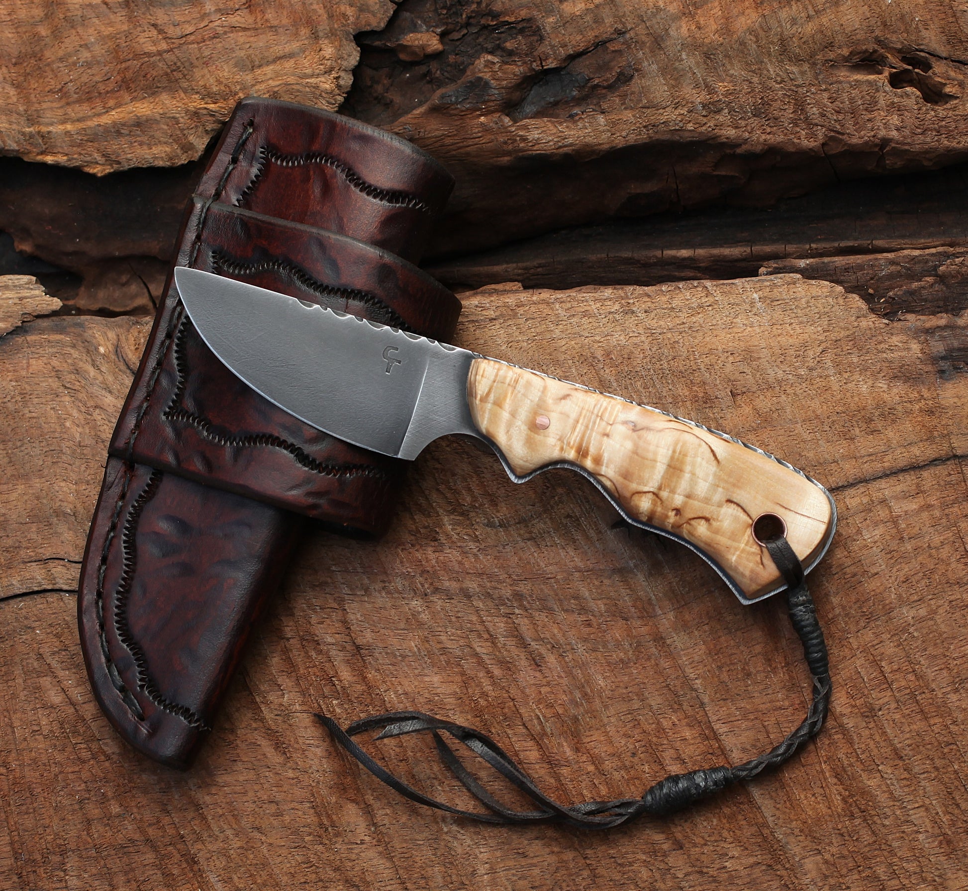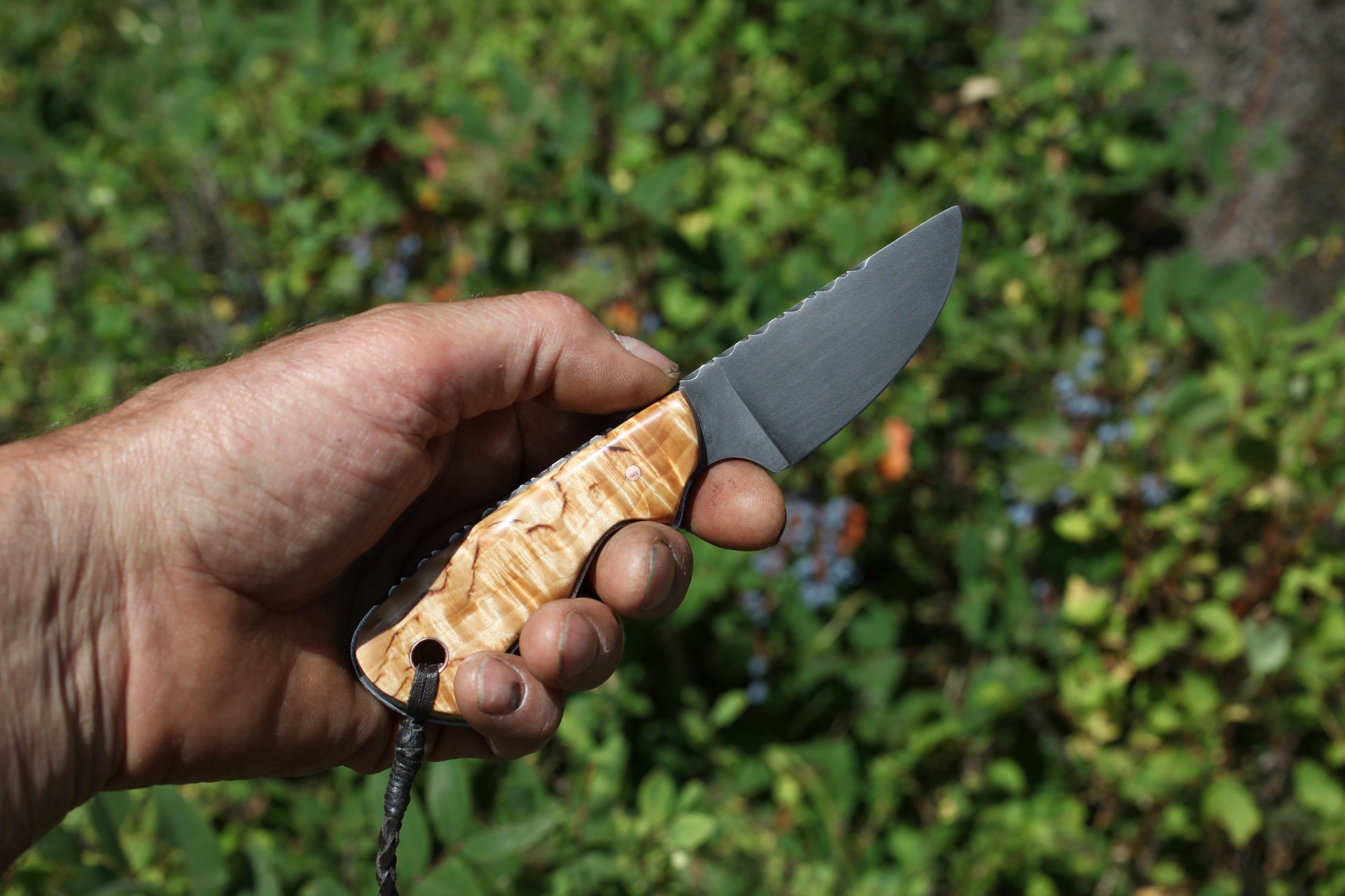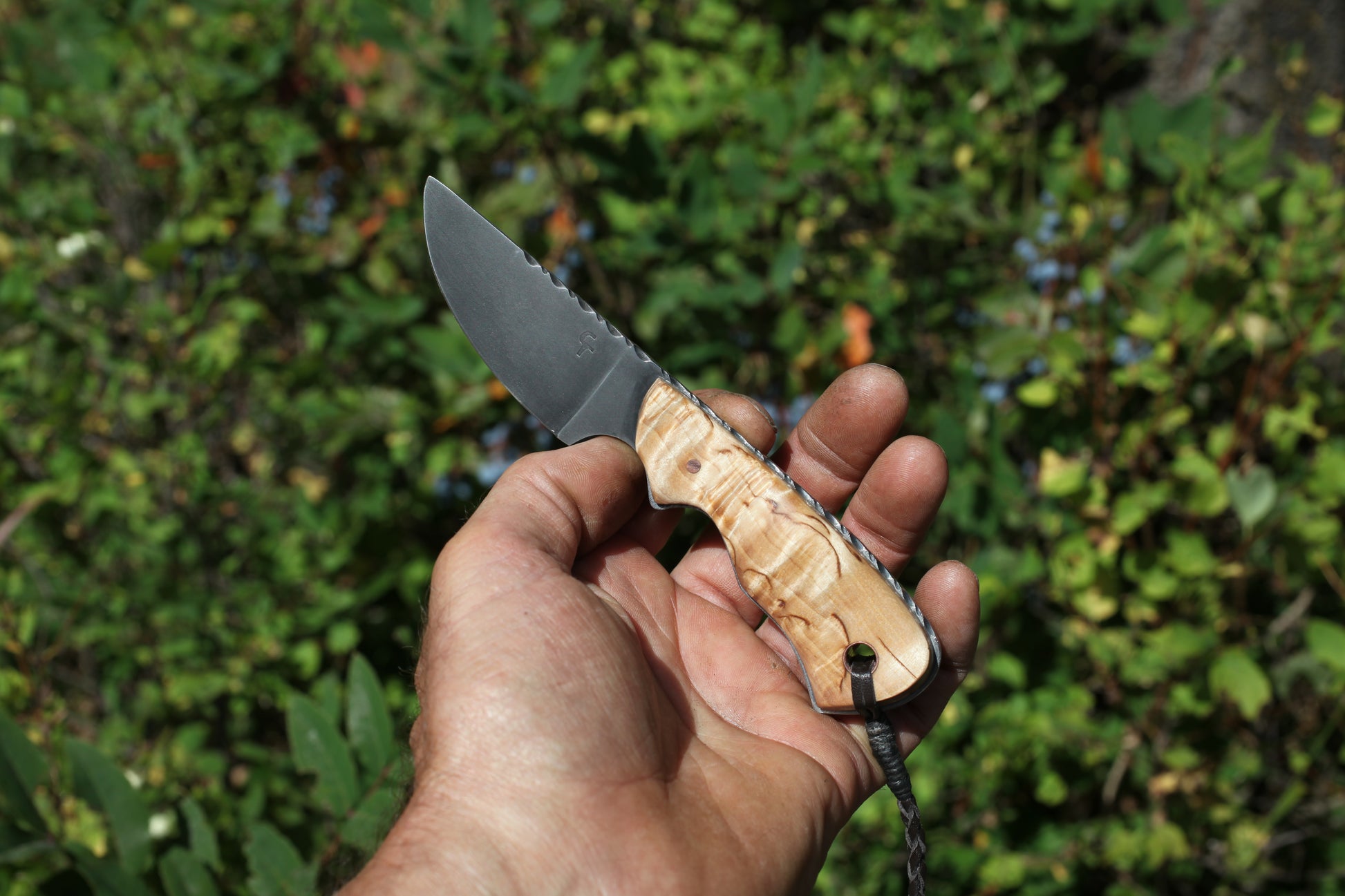 - Handle is stabilized Masur ( Karelian) birch. File work on spine of knife. Steel is proud on the handle.