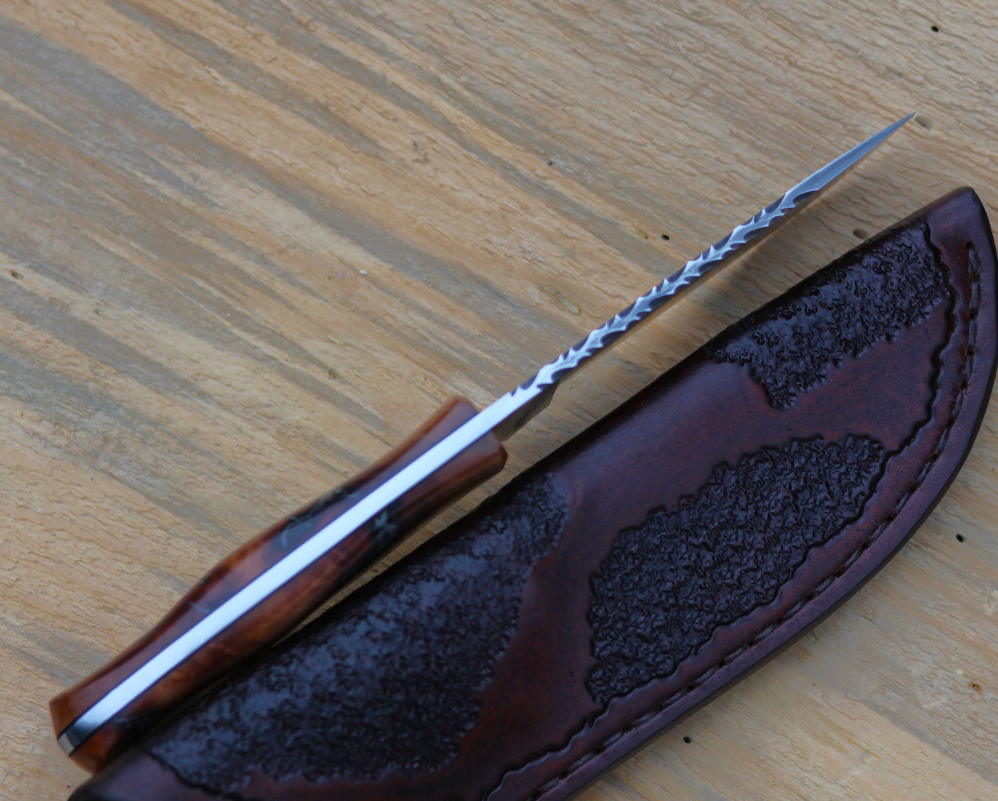 - Custom tooled handsewn leather sheath. Wet molded to fit snug.