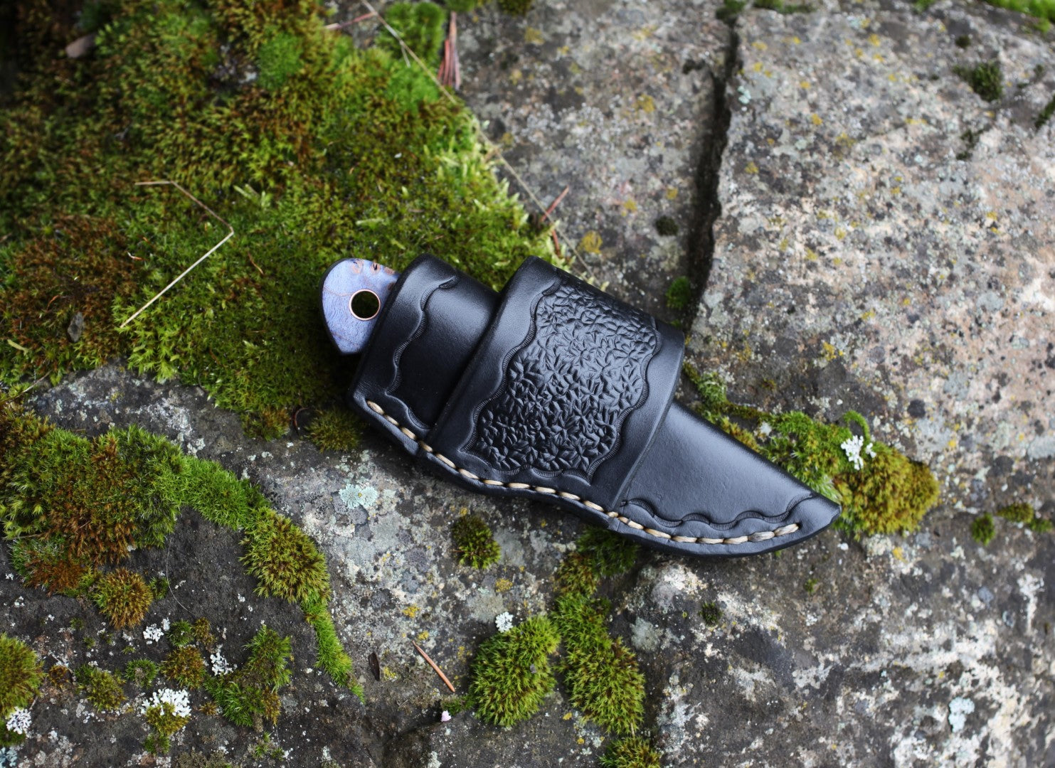 - Horizontal heavy leather sheath is custom fit and is formed to be worn on the left front for right hand draw, knife" pops" in the sheath and is very secure.
