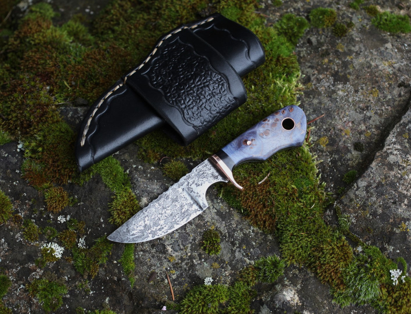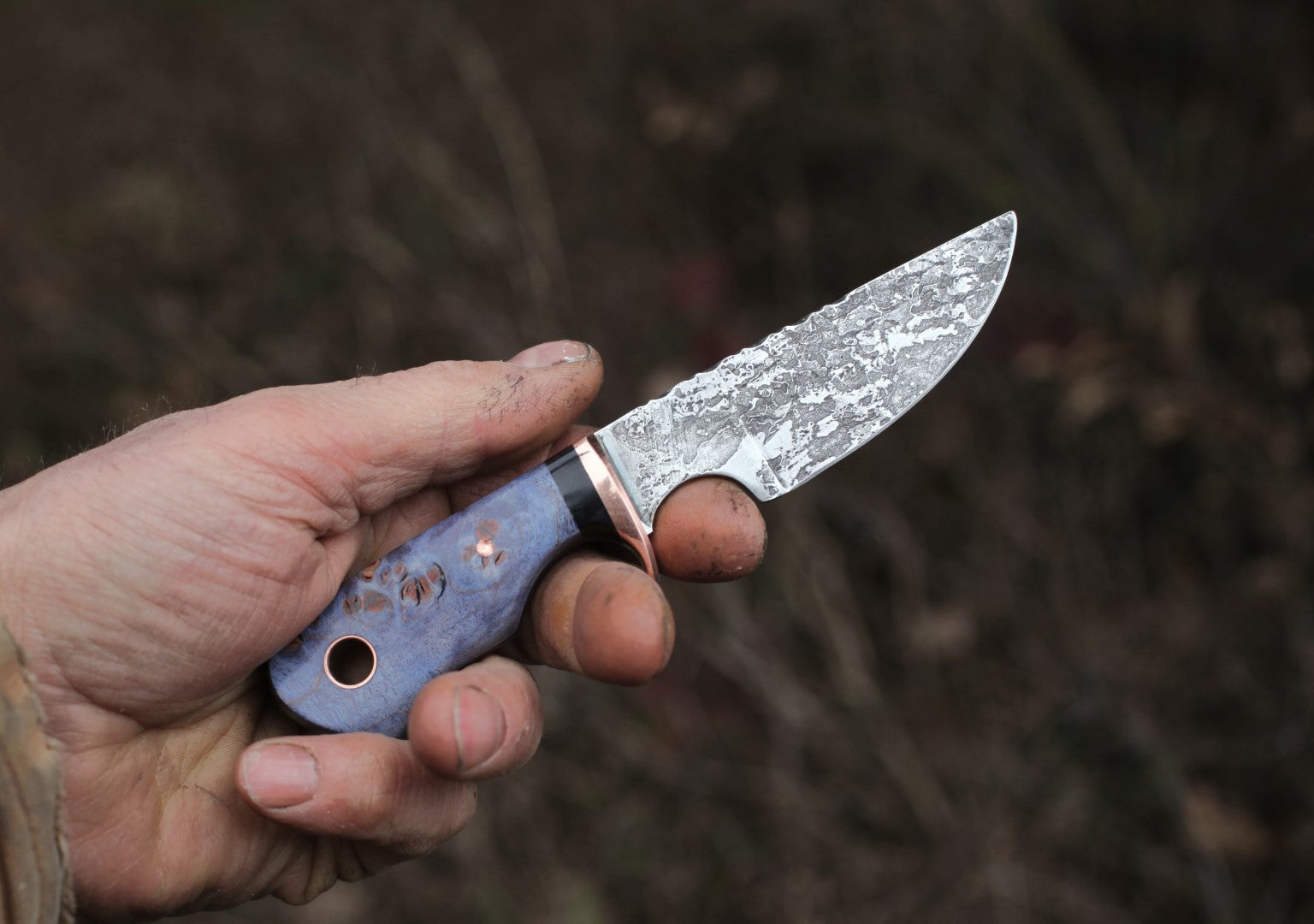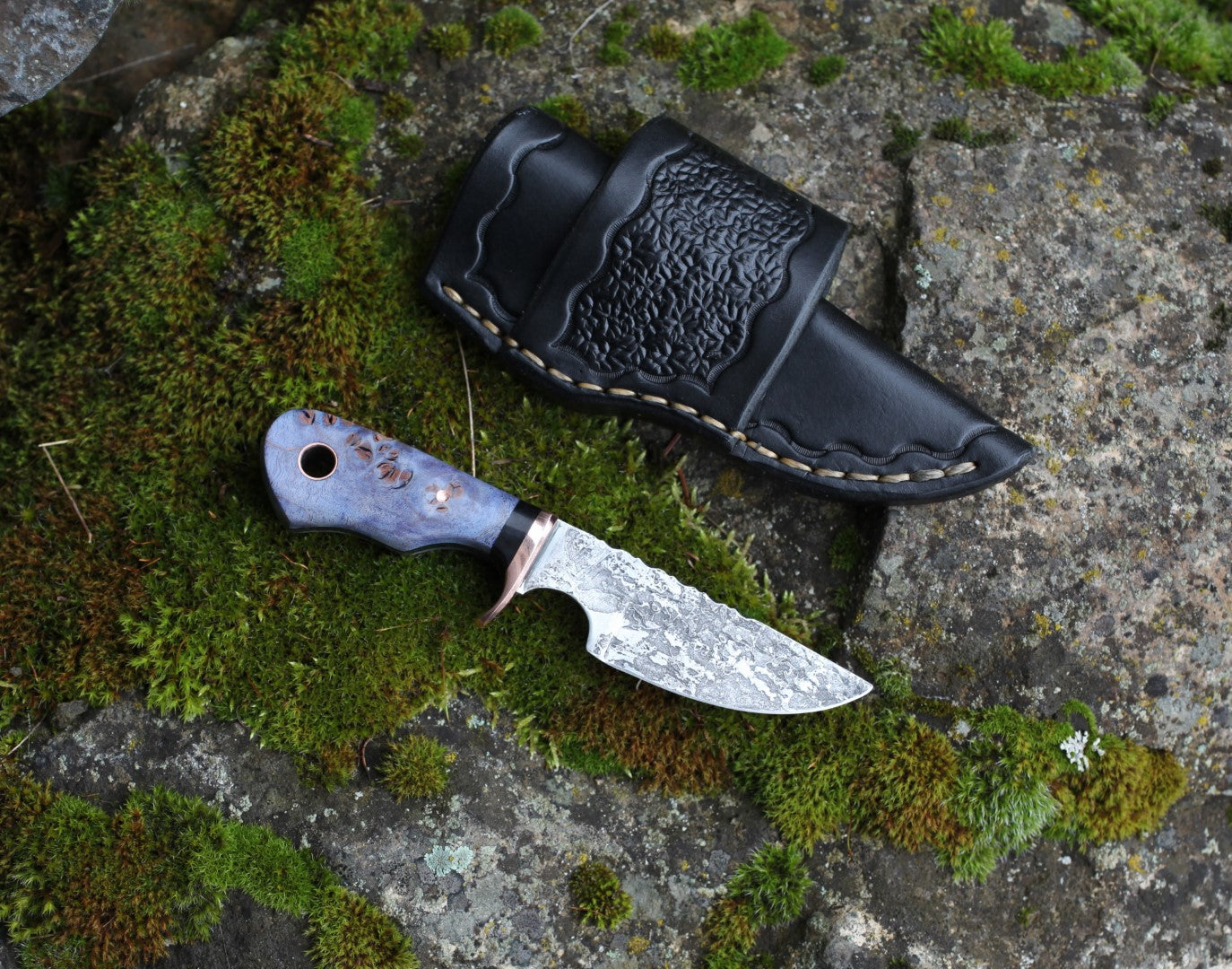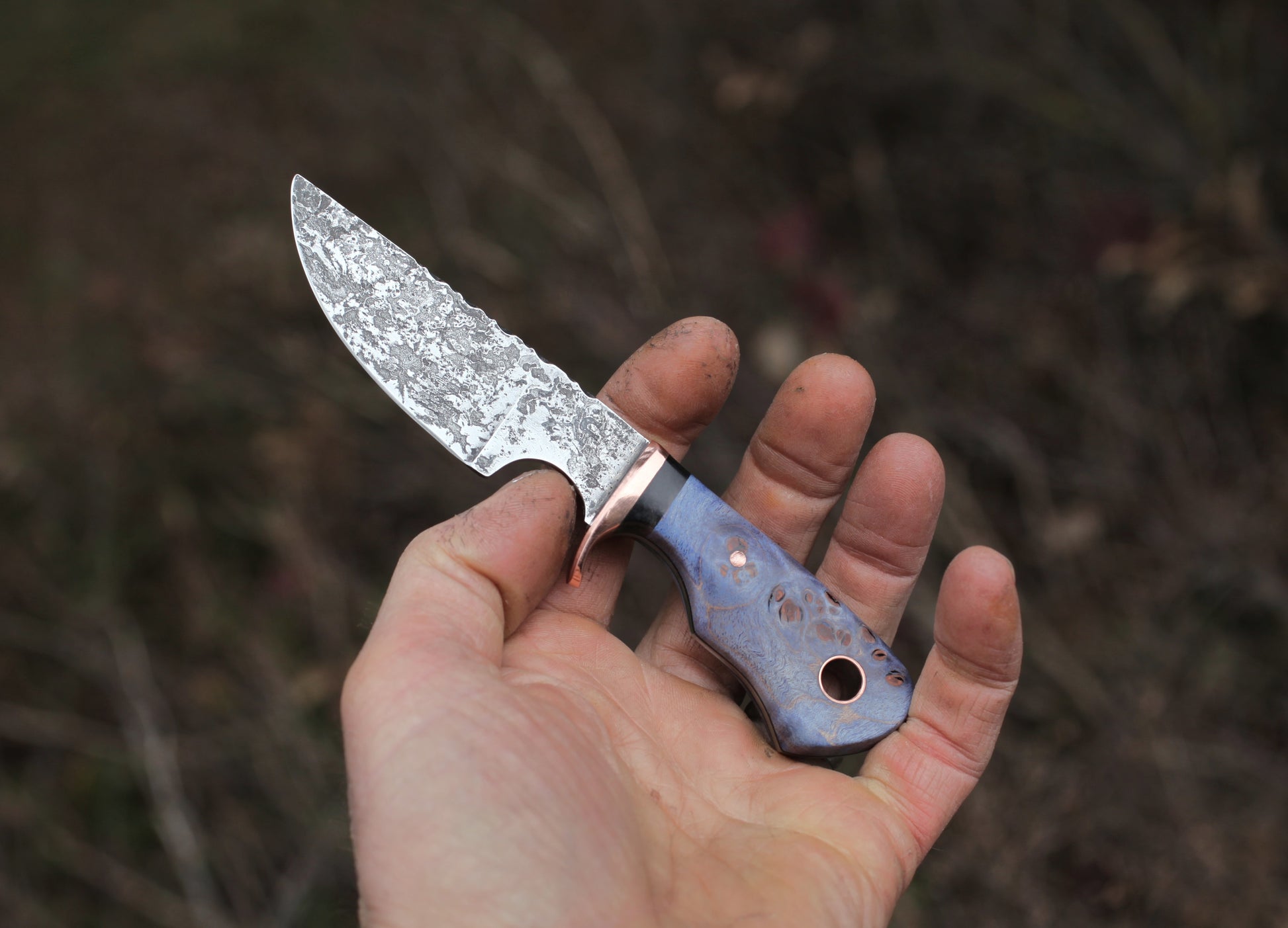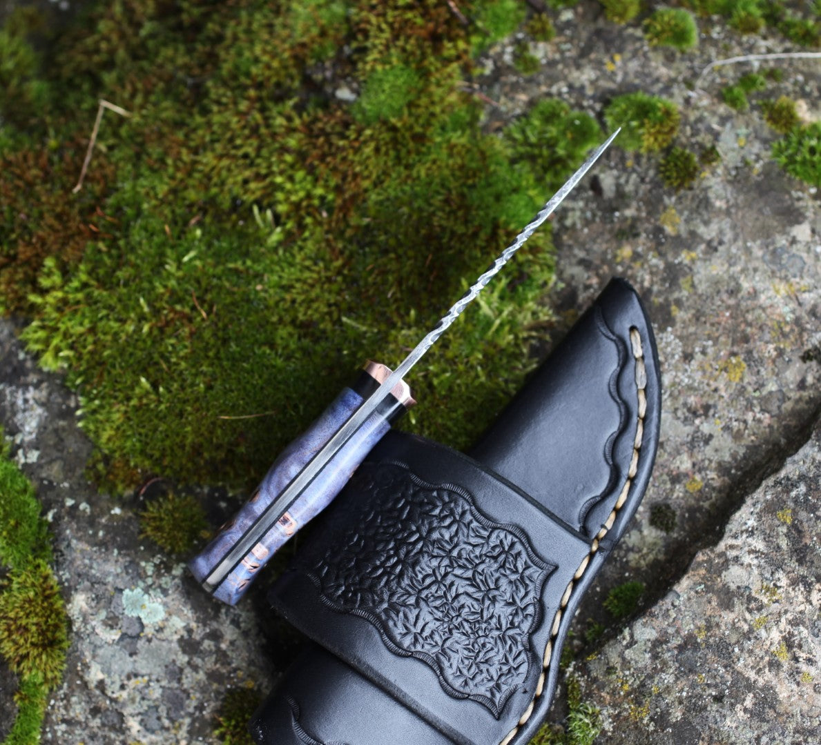 - Handle is stabilized blue maple burl with buffalo horn wood spacer and copper fittings.