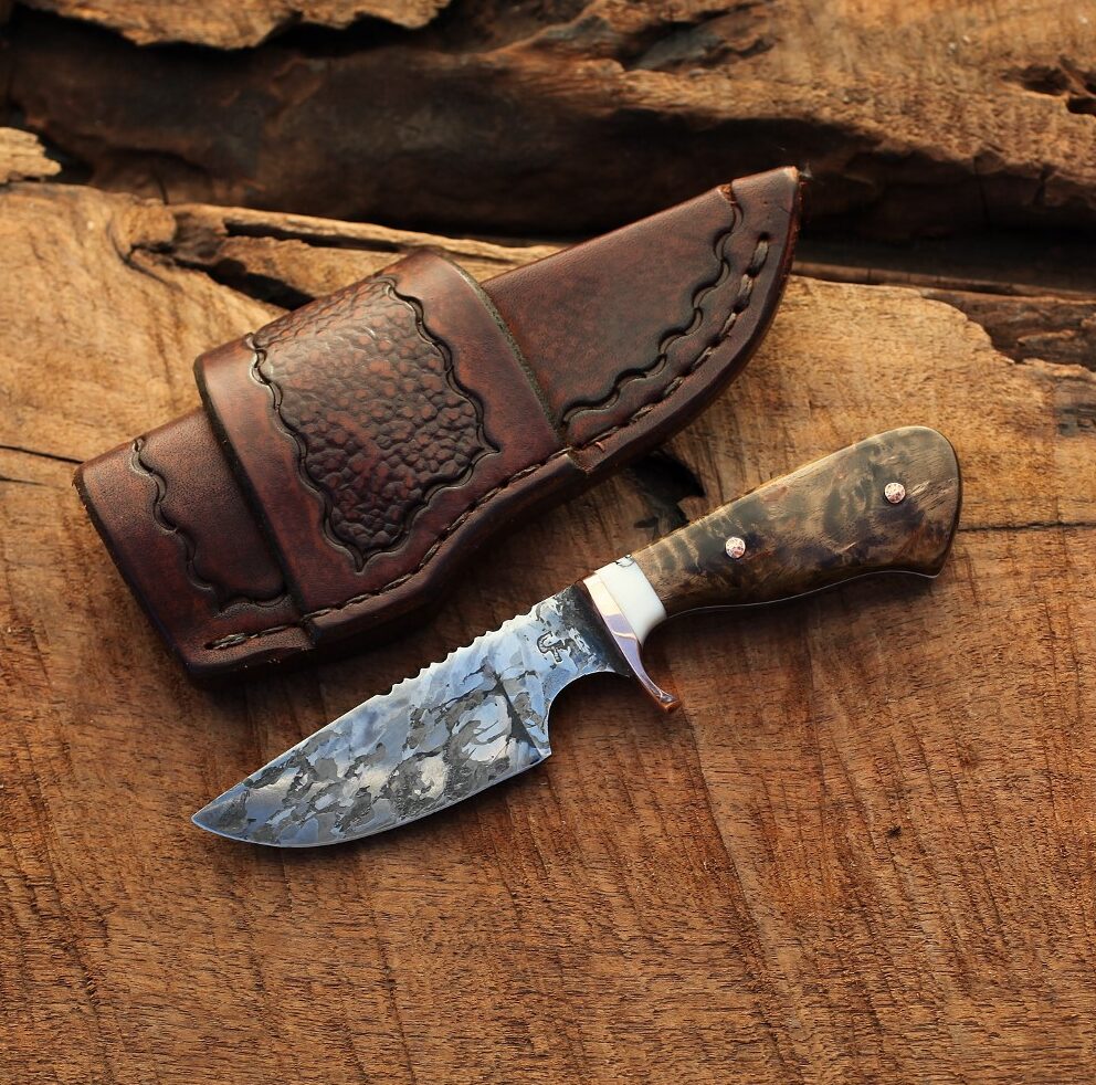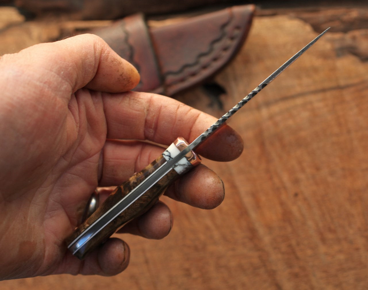 - Handle is stabilized maple burl with reconstituted white turquoise with white liners and copper fittings.