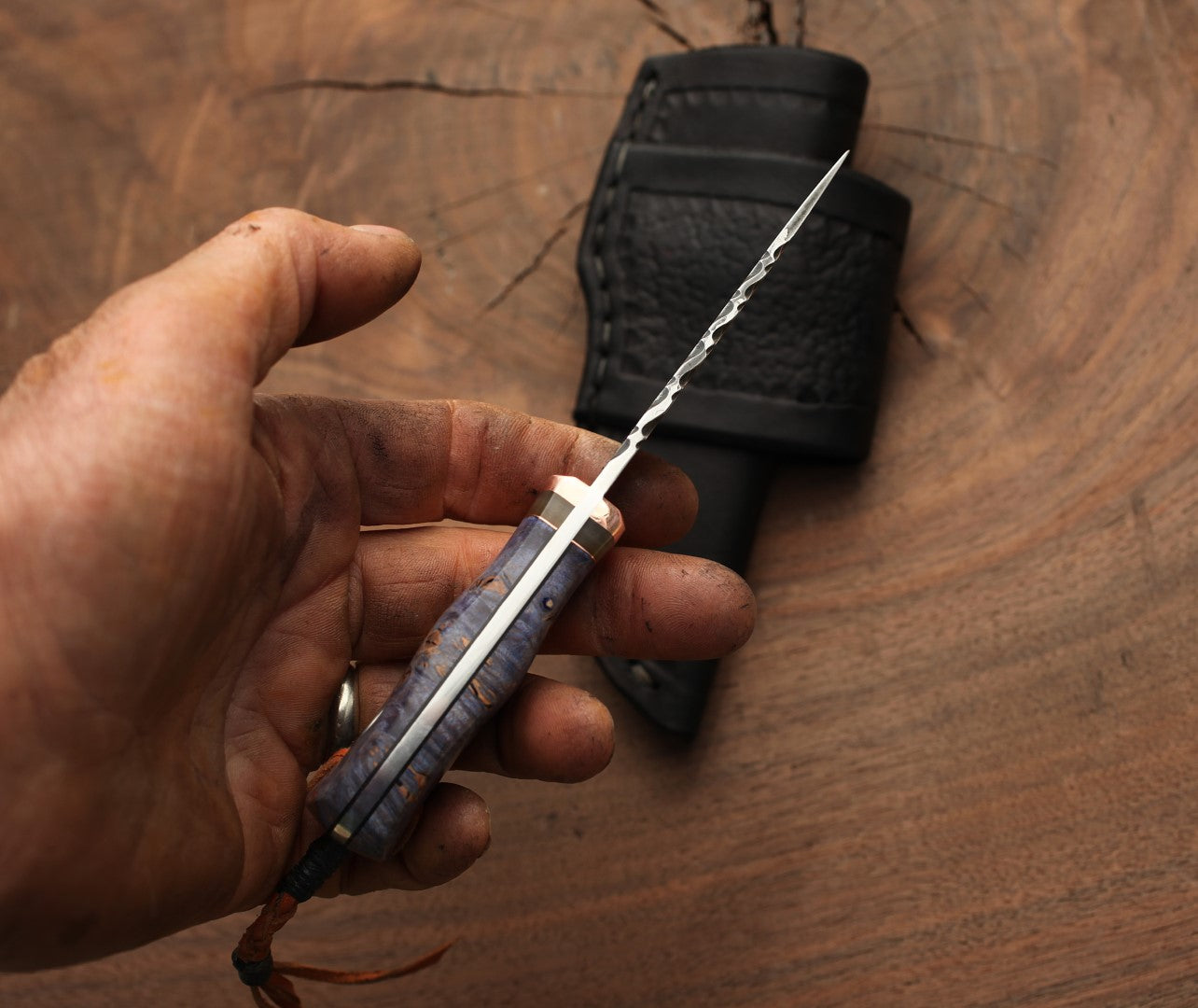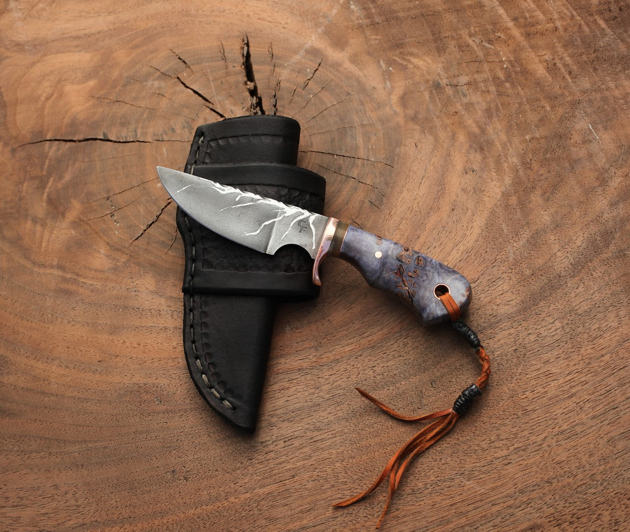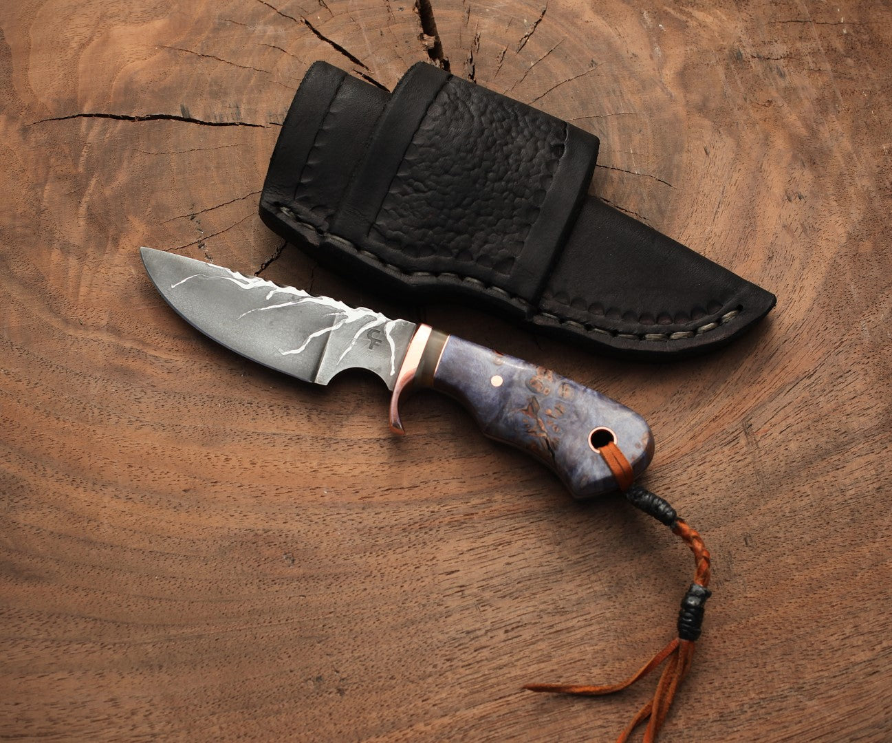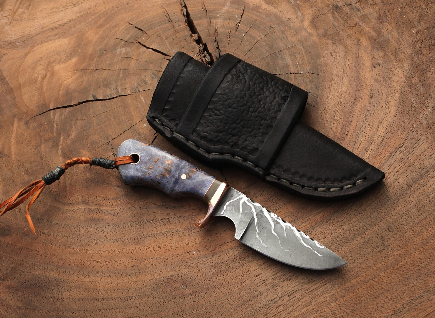 - Handle is stabilized blue maple burl with sheep horn spacer, copper pins and copper guard.