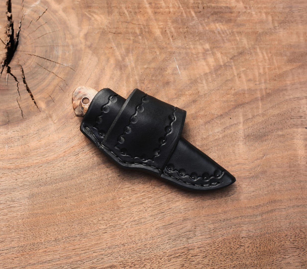 - Horizontal heavy leather sheath is custom fit and is formed to be worn on the left front for right hand draw, knife" pops" in the sheath and is very secure.