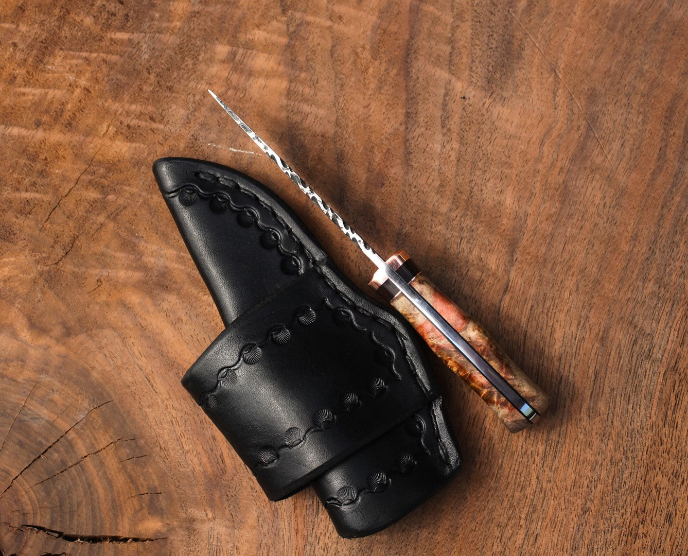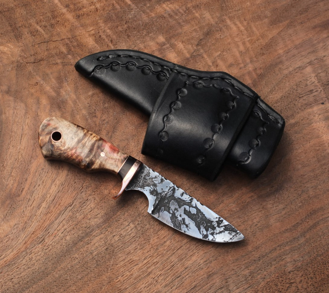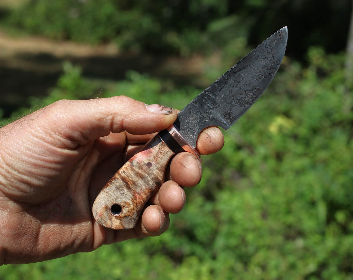 - Handle is stabilized spalted box elder burl with ebony spacer, black liners and copper fittings.