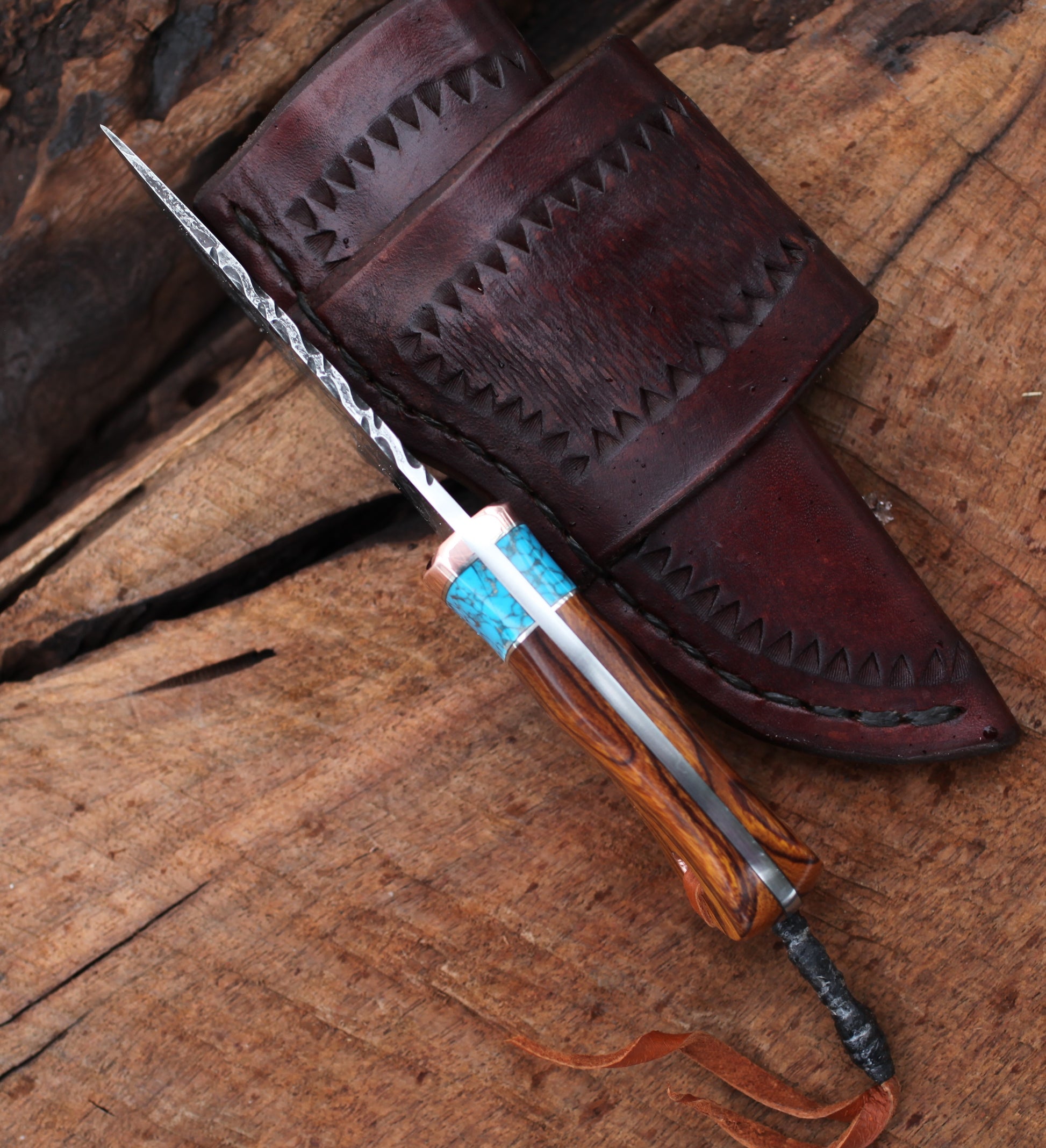 - Handle is Arizona ironwood with reconstituted turquoise stone with copper fittings.