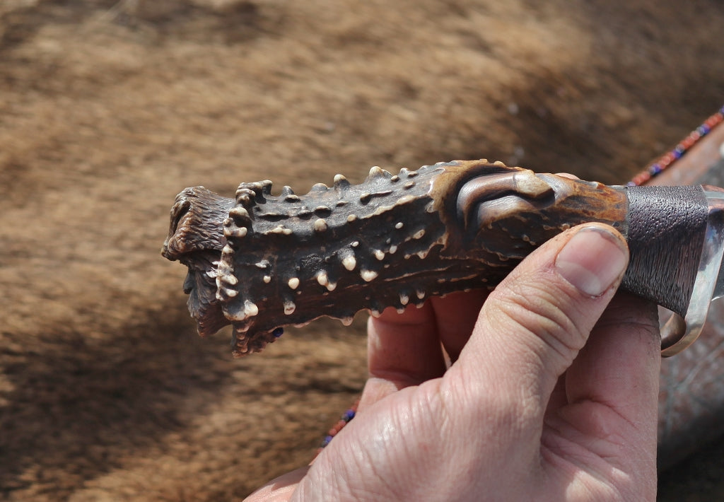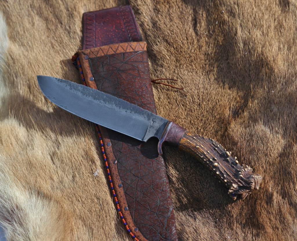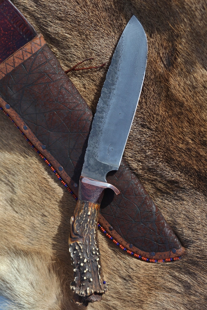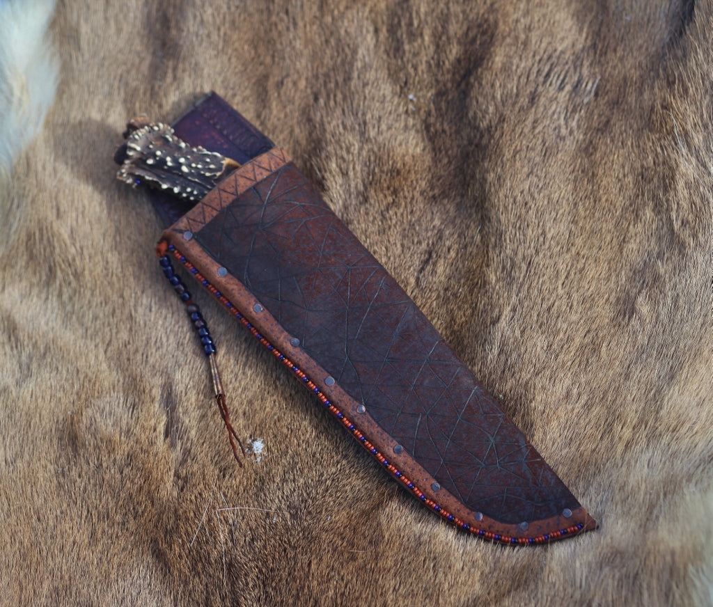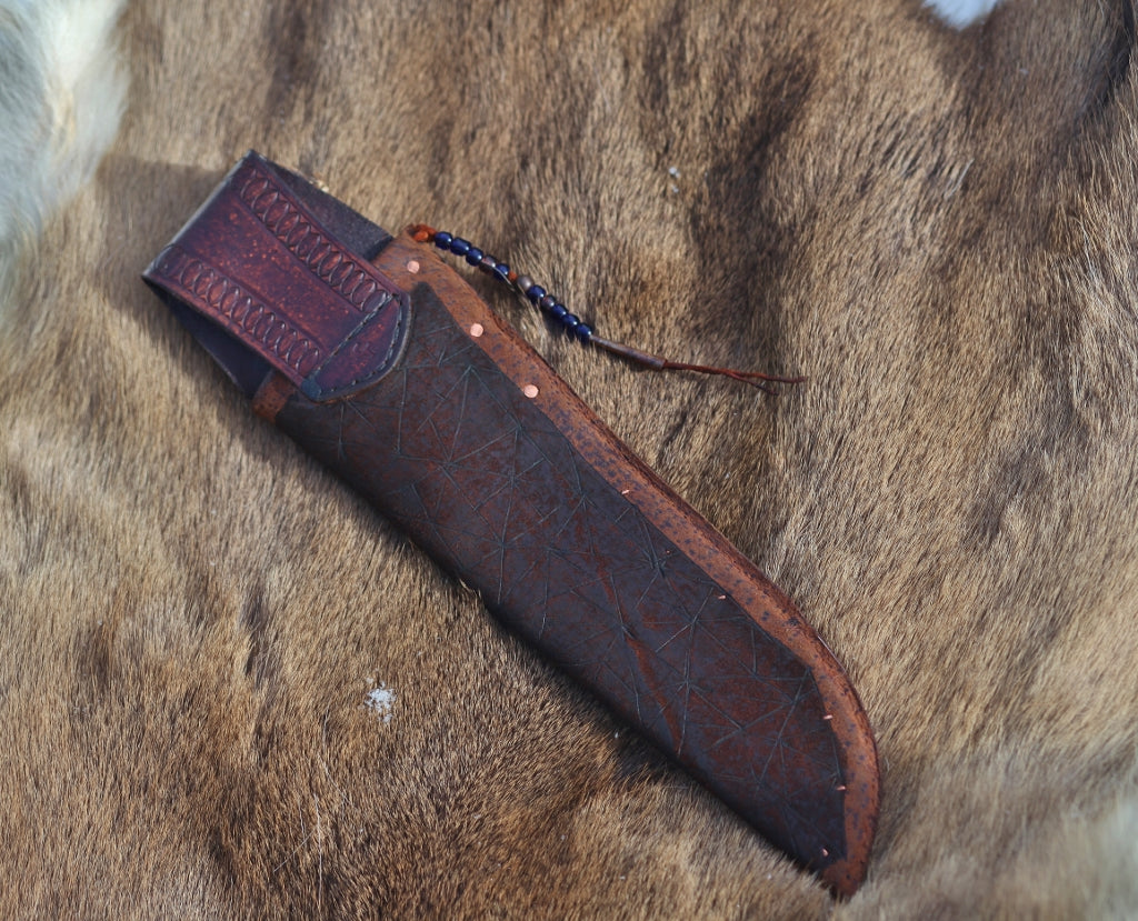 The sheath is pigskin over leather with copper tacks and trade beads and a copper cone.