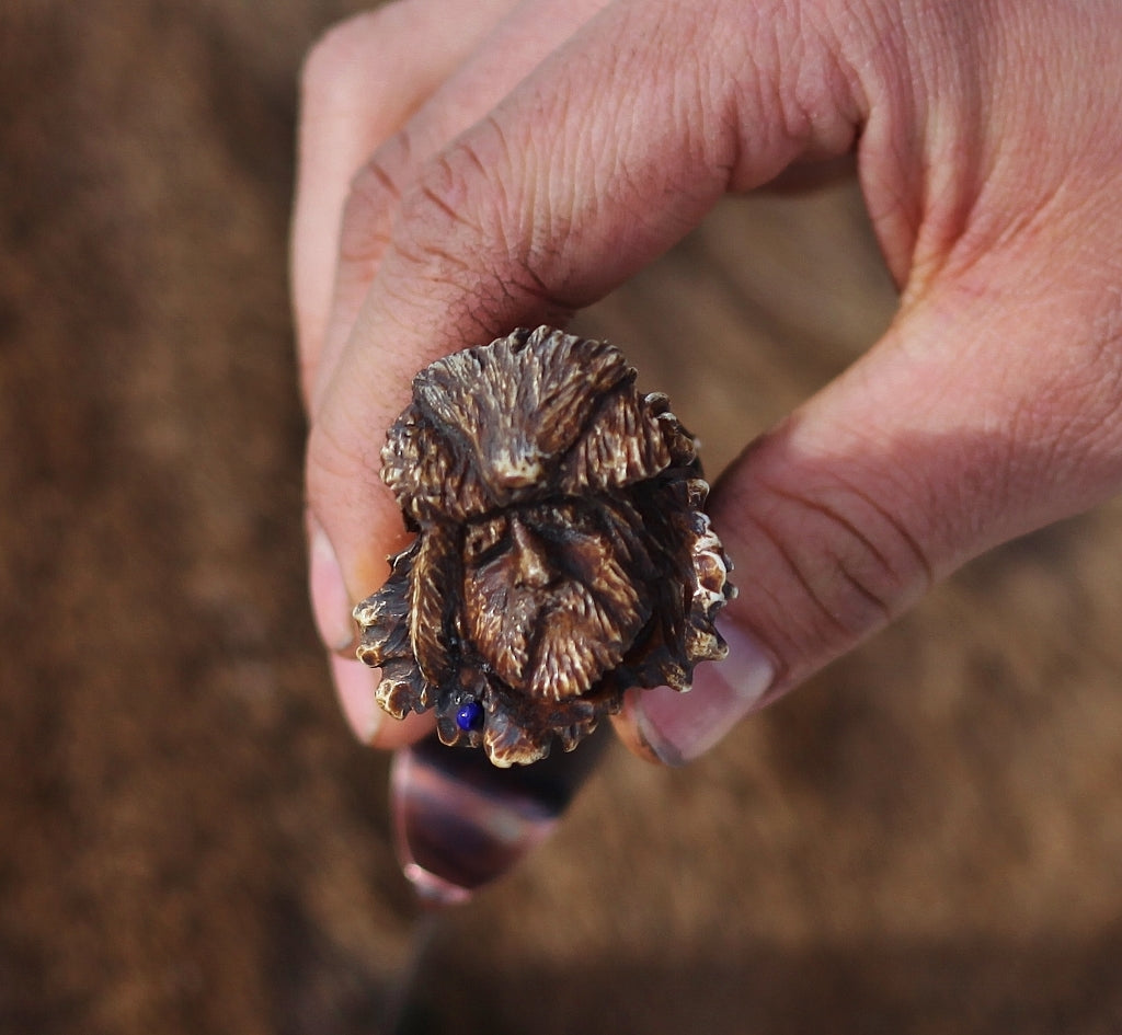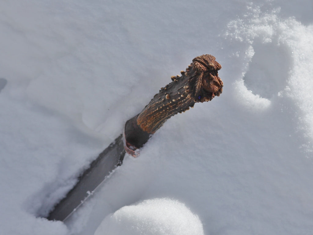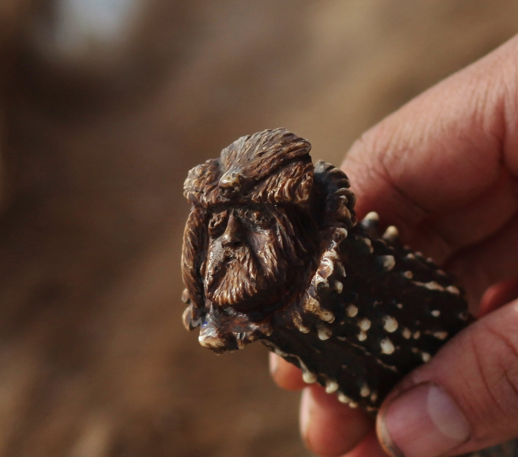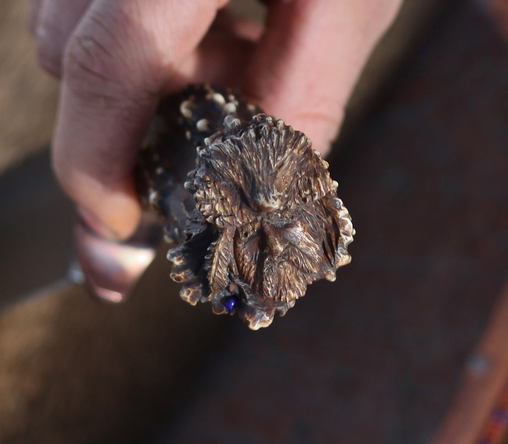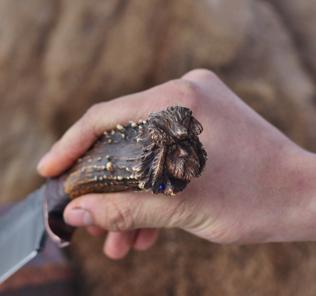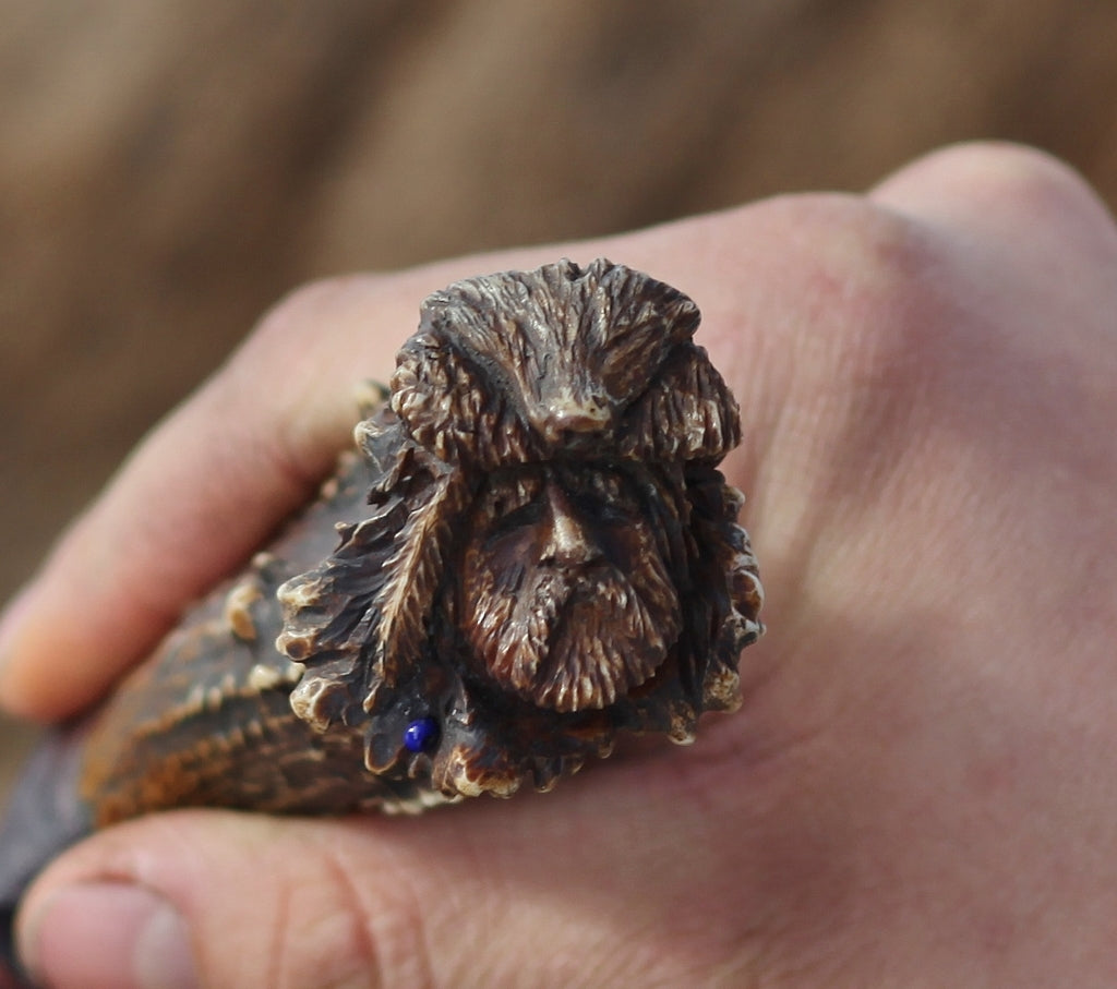 From my shop in the snow covered mountains of North Idaho. Another original piece by Master carver Paul Carrico, nationally known for his true to life wildlife carvings. No cast or resin here, this is the real thing, carved from a large whitetail antler, the burr end is a bearded mountain man with a badger skin hat and feather. Midway on the handle is a grizzly claw.