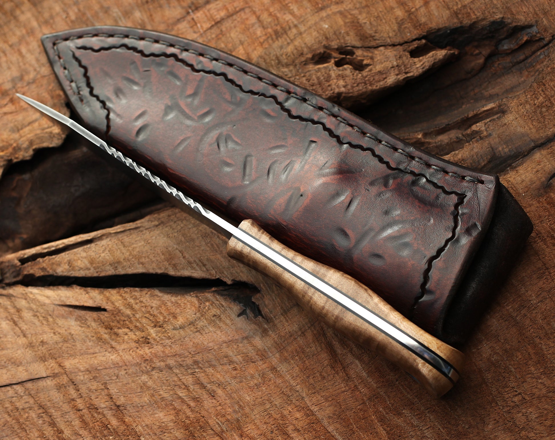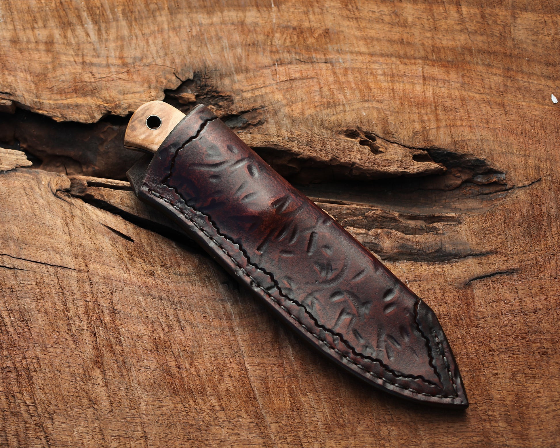 - Form fitted custom tooled leather sheath.
