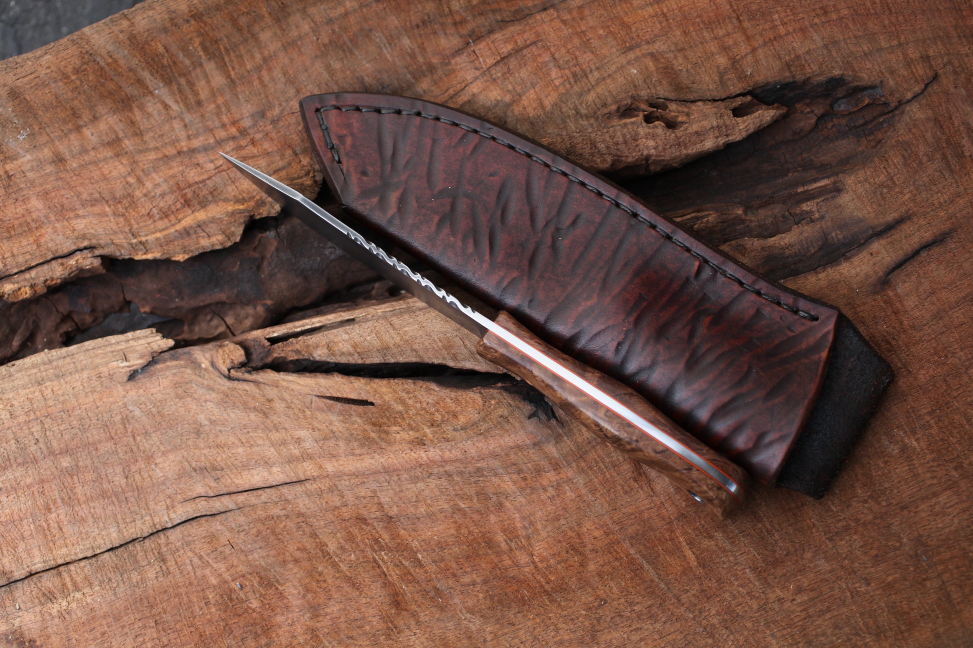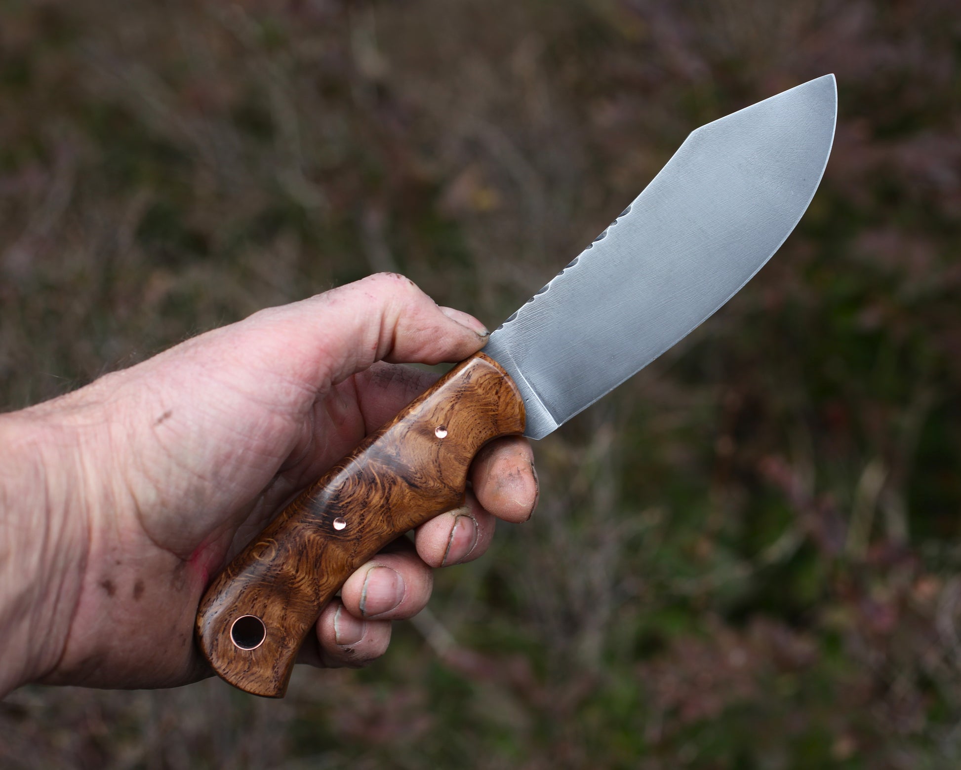 From my shop in the mountains of North Idaho: Handcrafted from 1/8 inch thick lumber mill saw steel, holds a great edge while being easy to maintain with the sharpening strop provided