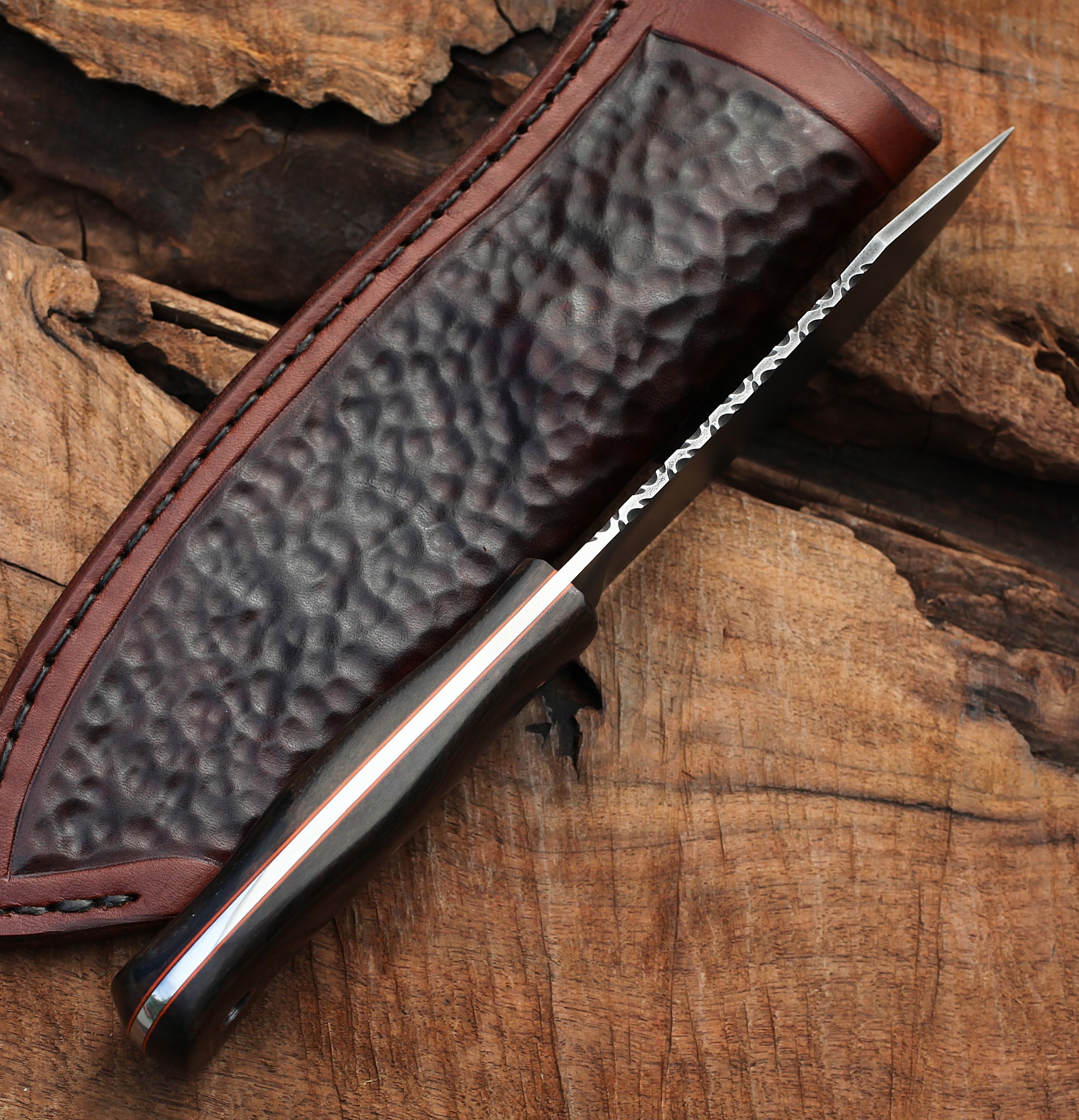 Keywords: light weight camp knife, carbon steel, pack, guide, elk, bison, moose, Arkansas, Ohio, USA made, hunting knife, etched 8670 tool steel