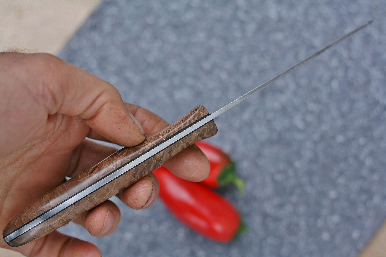 A little shorter than my regular chefs blade. This one also is crafted from recycled Idaho lumber mill saw steel. The steel is reground, oil heat treated, tempered and etched. Sharpened to a razors edge.