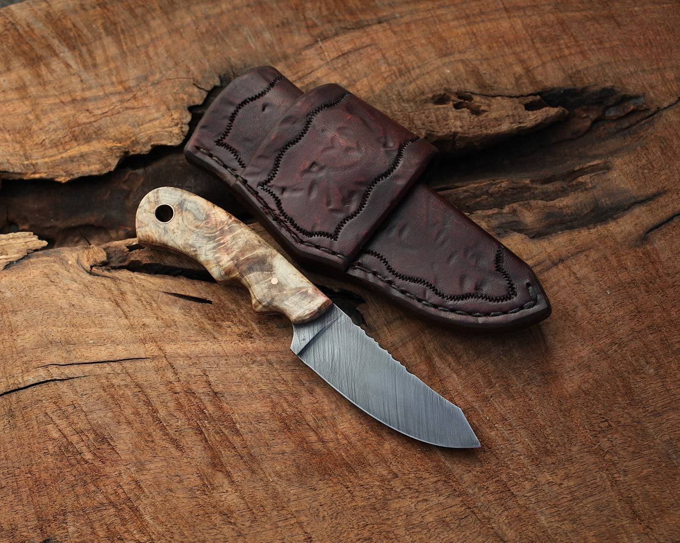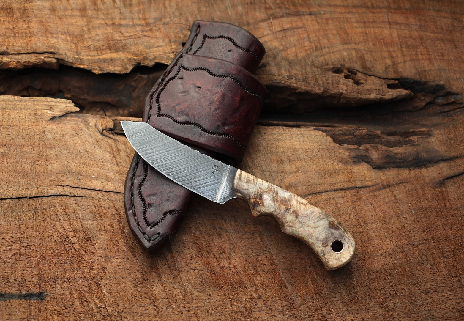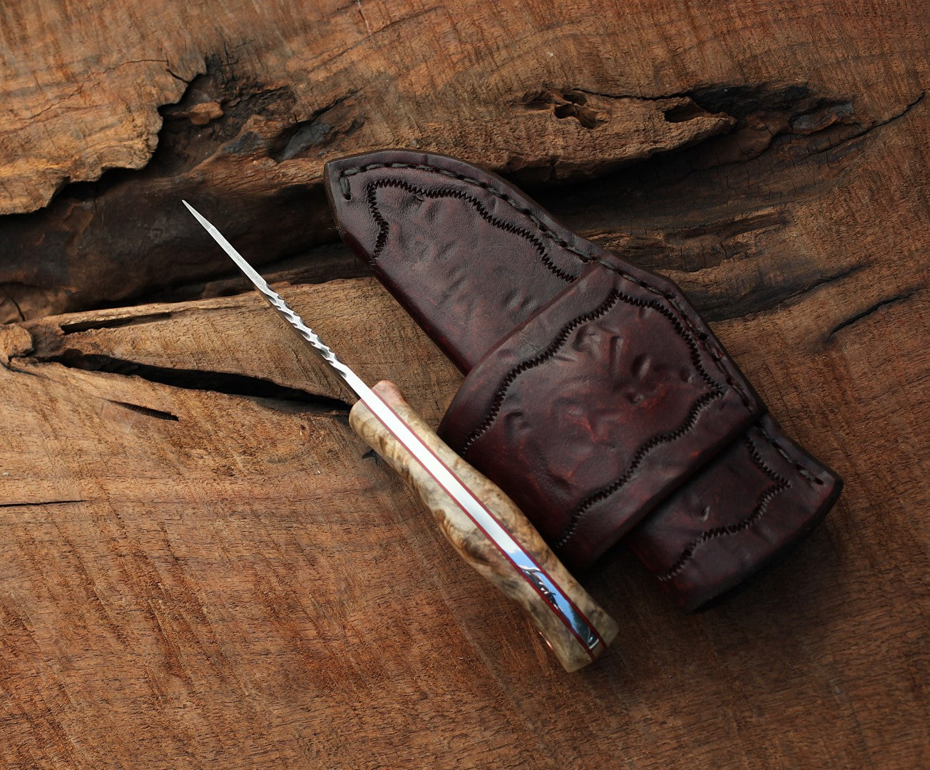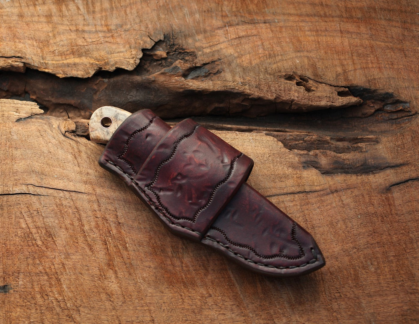 - Horizontal carry heavy leather sheath is hand tooled and sewn. Knife "pops" into sheath and stays put. Worn on the left front for right hand draw, concealable under a long shirt.