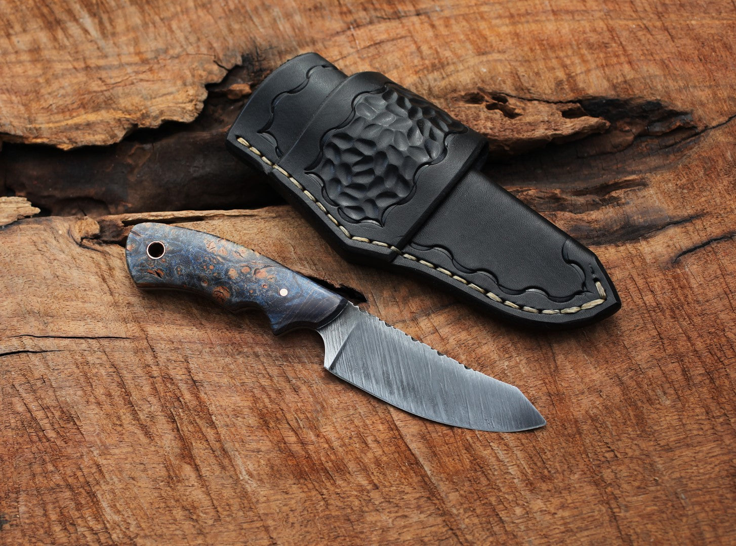 - Handle is eye catching stabilized blue maple burl with black liners and copper pin/tube.